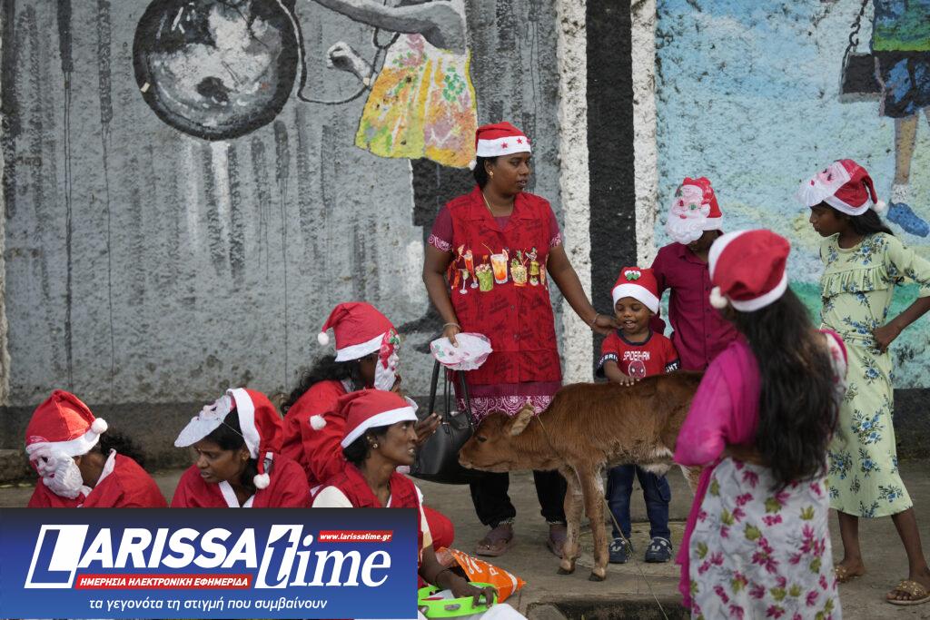 Χριστιανοί ντυμένοι με στολή Άγιου Βασίλη χαϊδεύουν ένα μοσχάρι πριν συμμετάσχουν σε χριστουγεννιάτικες εκδηλώσεις στην Τσενάι, Ινδία, την Κυριακή 22 Δεκεμβρίου 2024. (AP Photo/Mahesh Kumar A.)