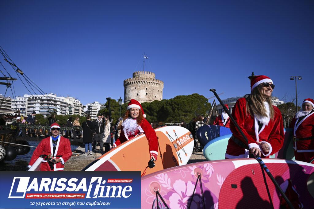 Ντυμένοι με στολή Άγιου Βασίλη, μεταφέρουν εξοπλισμό για το Santa SUP (Stand Up Paddle) surfing, στη Θεσσαλονίκη, βόρεια Ελλάδα, την Κυριακή 22 Δεκεμβρίου 2024. (AP Photo/Giannis Papanikos)