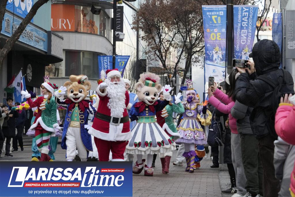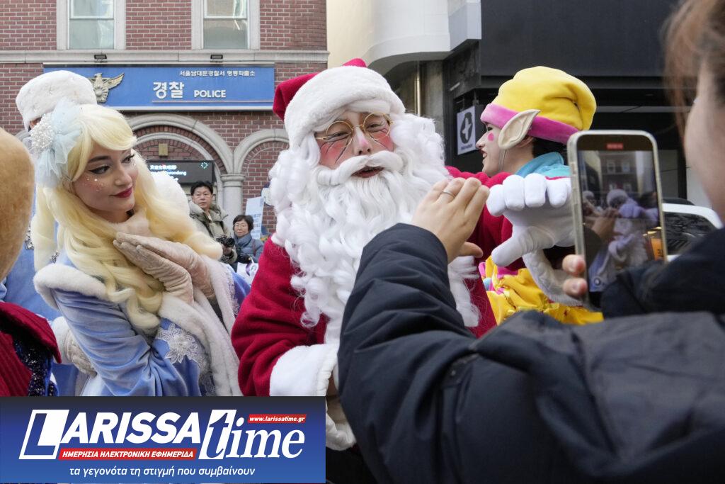 Ένας περφόρμερ ντυμένος με στολή Άγιου Βασίλη φωτογραφίζεται από κόσμο κατά τη διάρκεια εκδήλωσης στους δρόμους για την προώθηση του χριστουγεννιάτικου φεστιβάλ ενός θεματικού πάρκου στο κέντρο της Σεούλ, Νότια Κορέα, τη Δευτέρα 23 Δεκεμβρίου 2024. (AP Photo/Ahn Young-joon)