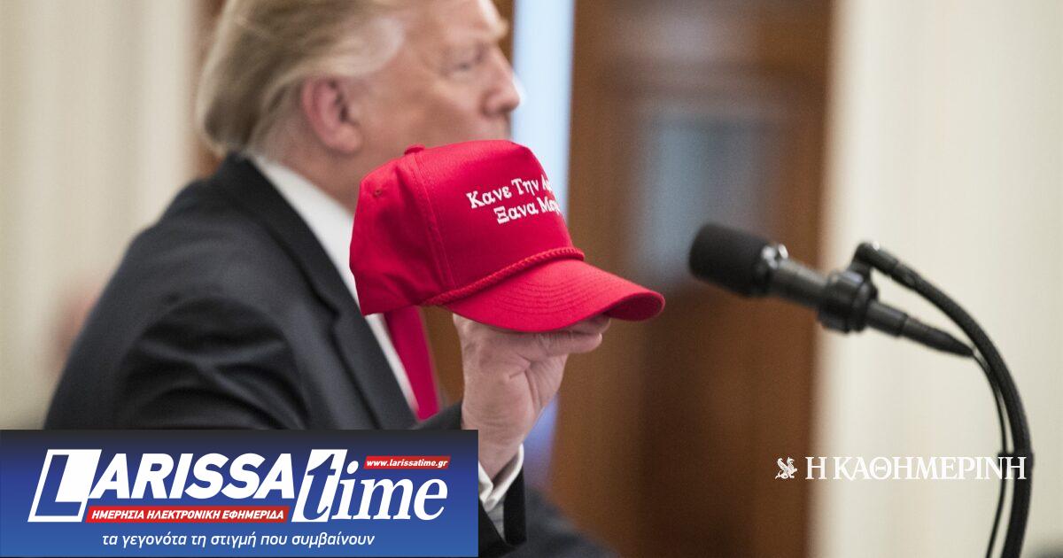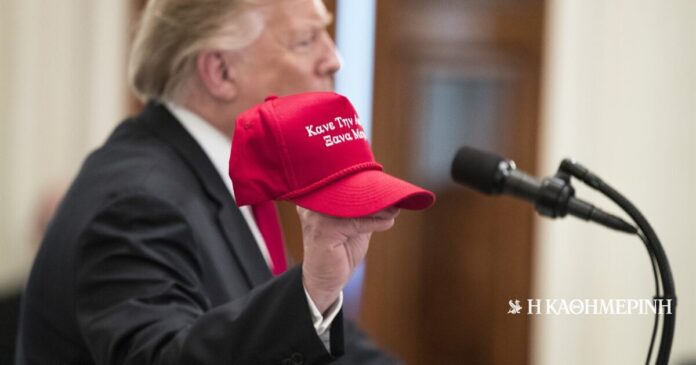 Κεντρική φωτό: Ο Ντόναλντ Τραμπ στον Λευκό Οίκο επιδεικνύει καπέλο με το σλόγκαν «Κάνε την Αμερική Ξανά Μεγάλη», στο πλαίσιο της δεξίωσης για την επέτειο της Ελληνικής Επανάστασης, τον Μάρτιο του 2019. [Sarah Silbiger/The New York Times]