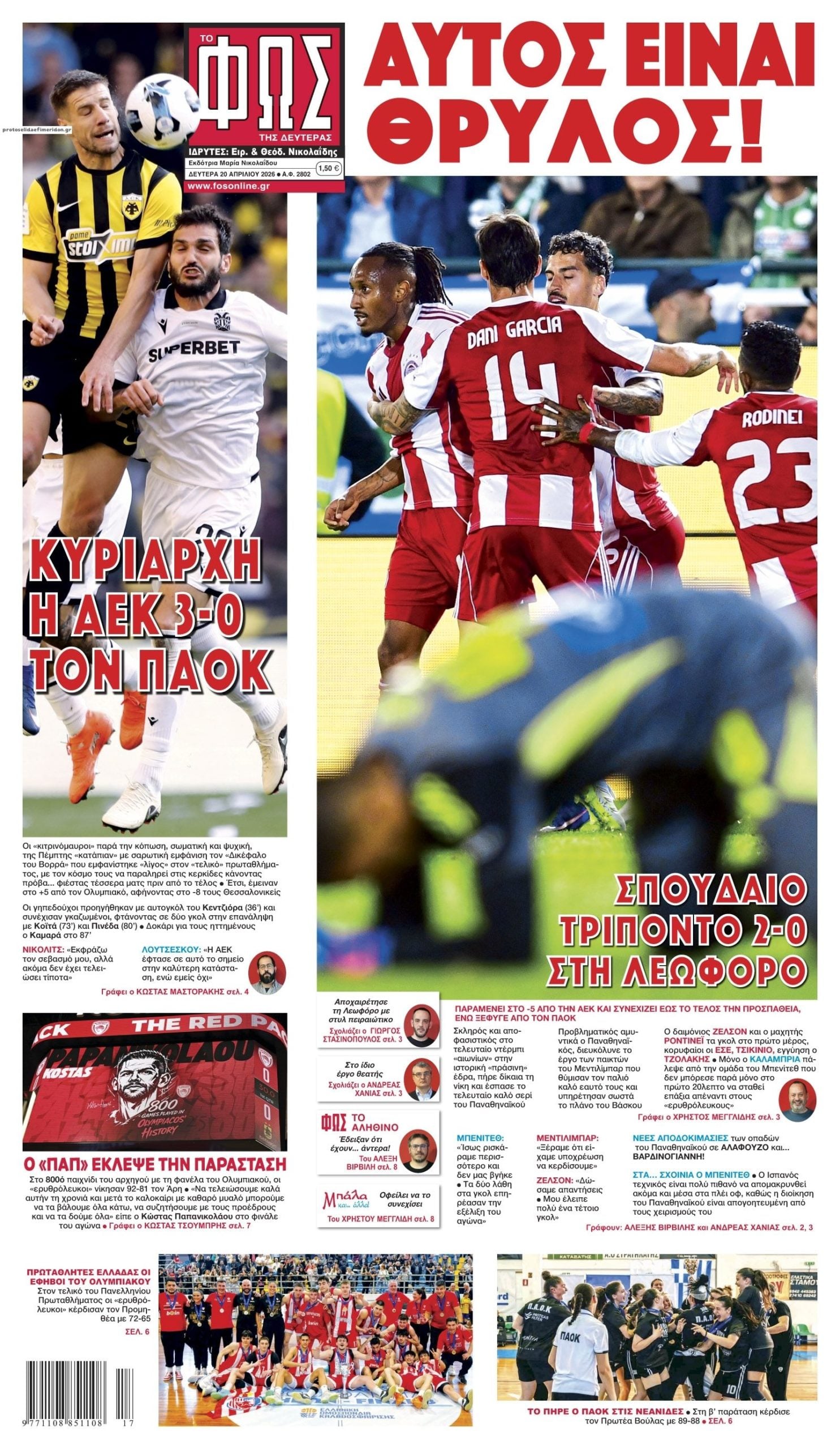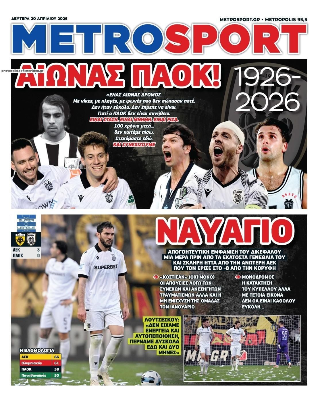 Διαβάστε τα πρωτοσέλιδα από τις αθλητικές εφημερίδες, σήμερα 20/4/2026.