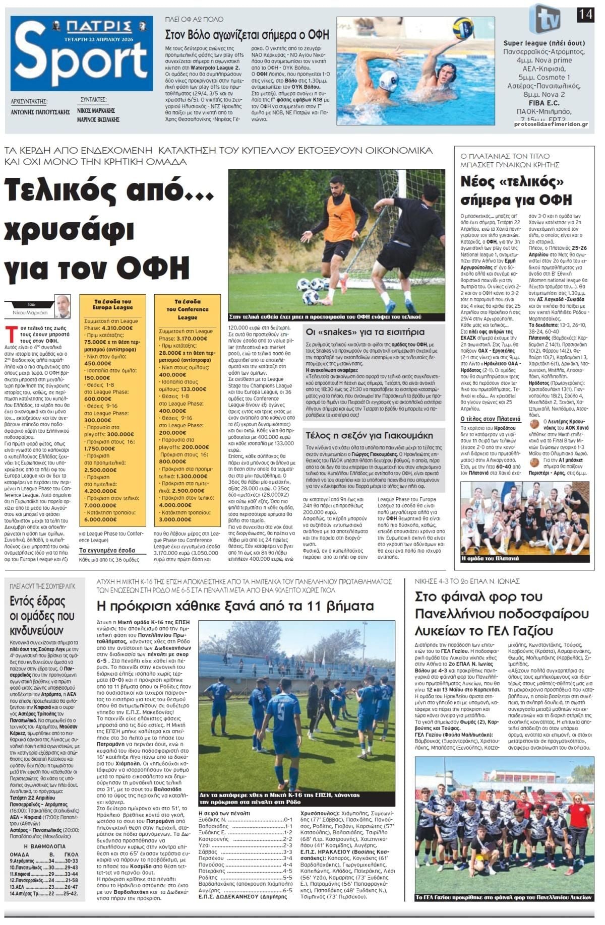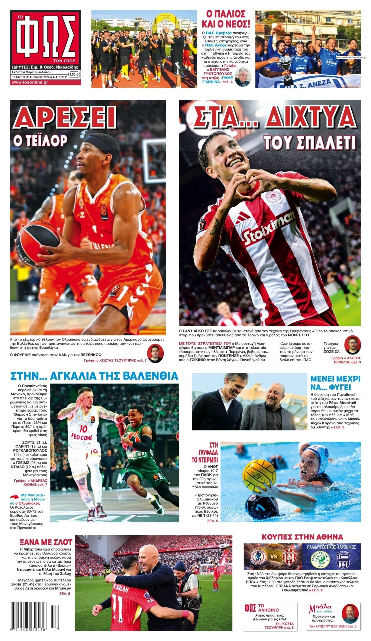 Οι αθλητικές εφημερίδες 22/4/2026