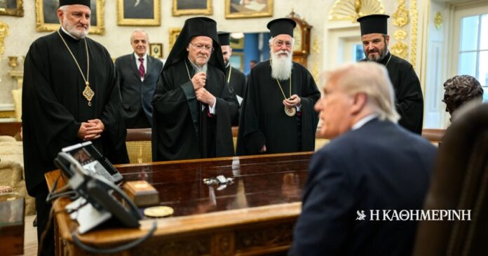 Οταν εκείνη την ημέρα ο Οικουμενικός Πατριάρχης πέρασε το κατώφλι του Λευκού Οίκου, τα μέλη της αποστολής που τον συνόδευε δεν μπορούσαν να φανταστούν όσα ακολούθησαν. Από αμερικανικής πλευράς, στη συνάντηση, πέραν του προέδρου Ντόναλντ Τραμπ, συμμετείχαν ο αντιπρόεδρος Τζέι Ντι Βανς, ο ελληνικής καταγωγής επικεφαλής του Γραφείου Επιστήμης και Τεχνολογικής Πολιτικής του Λευκού Οίκου, Μάικλ Κράτσιος, και ο πρώην προσωπάρχης του Λευκού Οίκου, Ράινς Πρίμπους. Δίπλα στον Οικουμενικό Πατριάρχη βρίσκονταν ο Αρχιεπίσκοπος Αμερικής κ. Ελπιδοφόρος, ο μητροπολίτης Λαοδικείας Θεοδώρητος, ο μητροπολίτης Σηλυβρίας Μάξιμος και ο Μέγας Εκκλησιάρχης και διευθυντής του Πατριαρχικού Γραφείου, πατέρας Αέτιος.