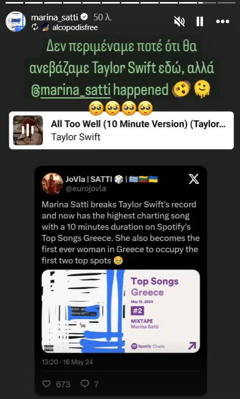 Επίσης, σε μία δεύτερη ανάρτησή της, η Μαρίνα Σάττι αναδημοσίευσε ένα post, στο οποίο ανέφερε ότι ξεπέρασε το προηγούμενο ρεκόρ της Τέιλορ Σουίφτ στην Ελλάδα. Επιπλέον, ανέφερε ότι το κομμάτι «MIXTAPE» από το νέο άλμπουμ της P.O.P είναι το τραγούδι με τη μακρύτερη διάρκεια, φτάνοντας τα 10 λεπτά, στο Top Songs Greece του Spotify.