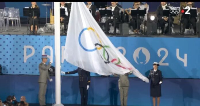 Ένα δεύτερο ντροπιαστικό απρόοπτο καταγράφηκε από τις κάμερες όταν έγινε η έπαρση της ολυμπιακής σημαίας. Οι Γάλλοι αξιωματικοί υψώνουν την ολυμπιακή σημαία αλλά οι τηλεθεατές διαπιστώνουν ότι έχει τοποθετηθεί ανάποδα και οι δύο κύκλοι (κίτρινος και πράσινος) βρίσκονται στην πάνω πλευρά.
