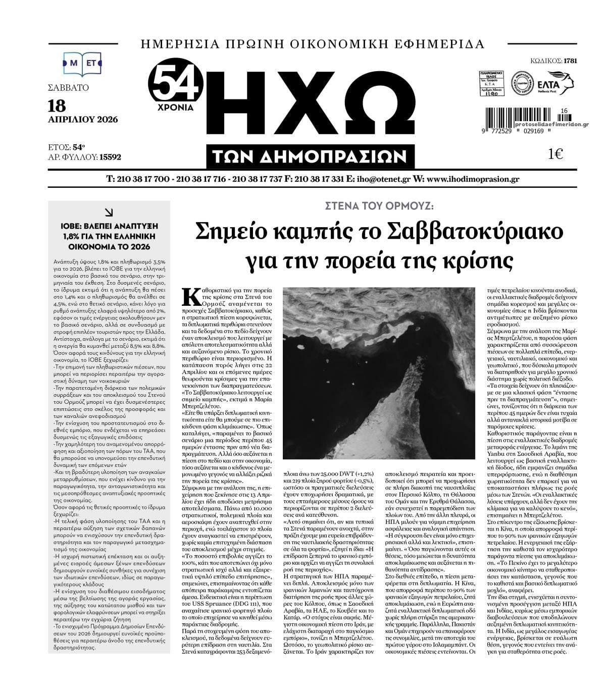 Διαβάστε τα πρωτοσέλιδα από τις οικονομικές εφημερίδες, σήμερα 18/4/2026.