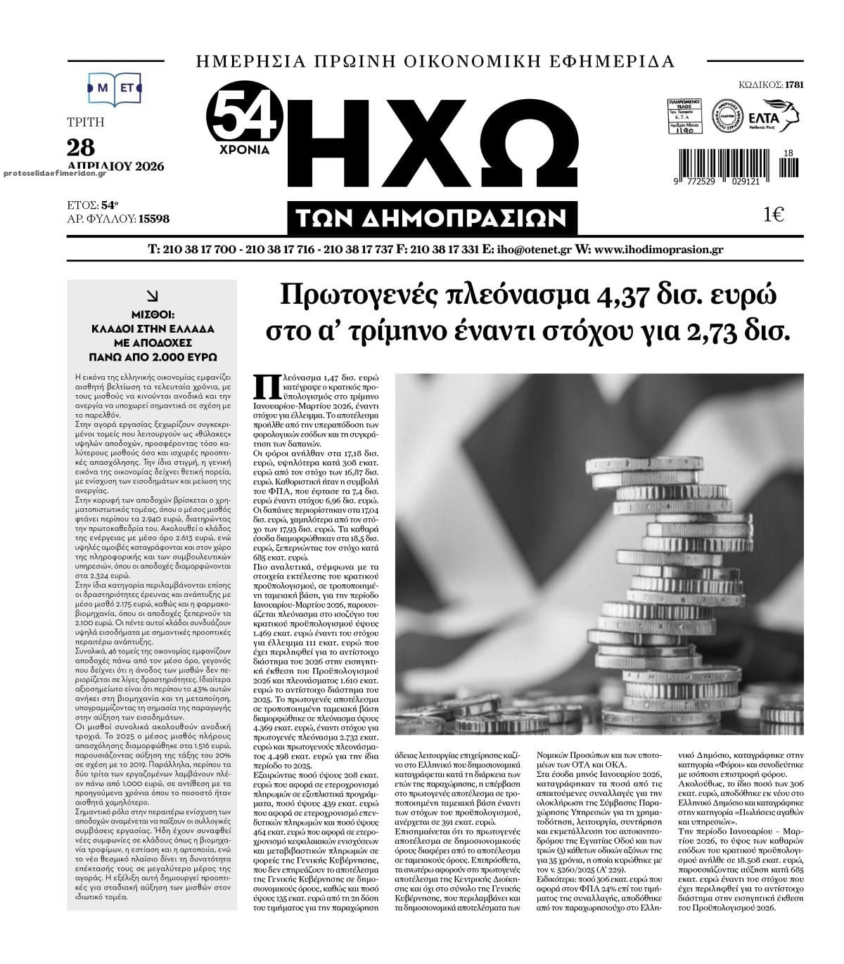 Διαβάστε τα πρωτοσέλιδα από τις οικονομικές εφημερίδες, σήμερα 28/4/2026.