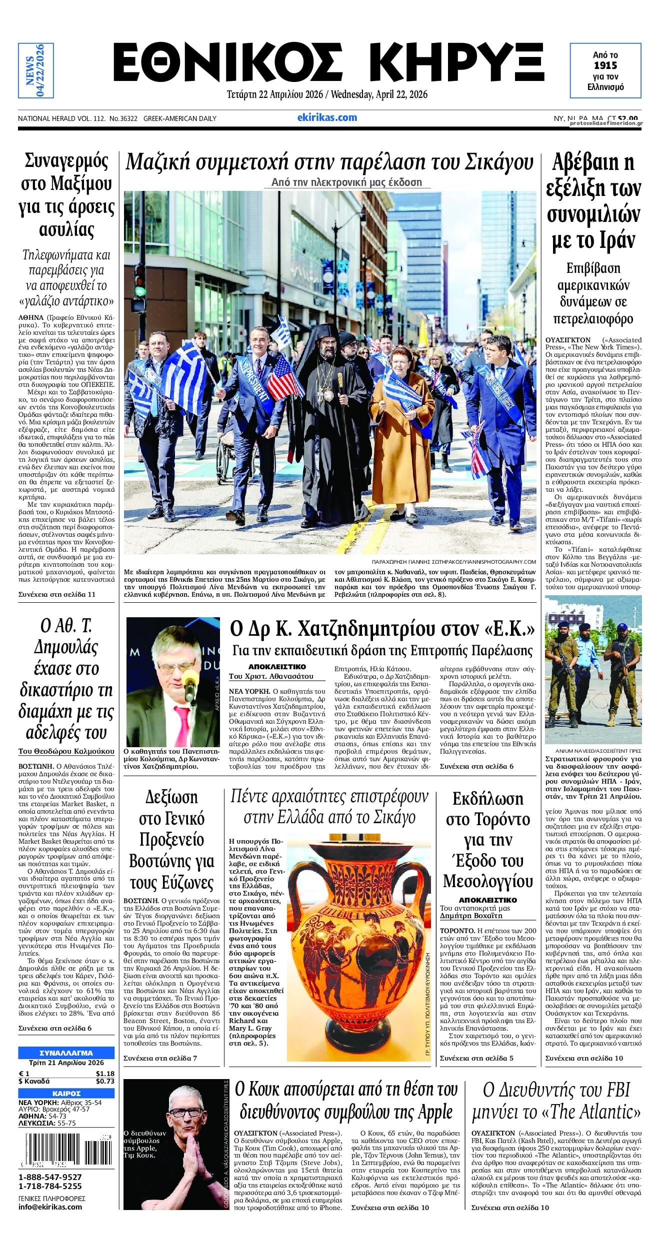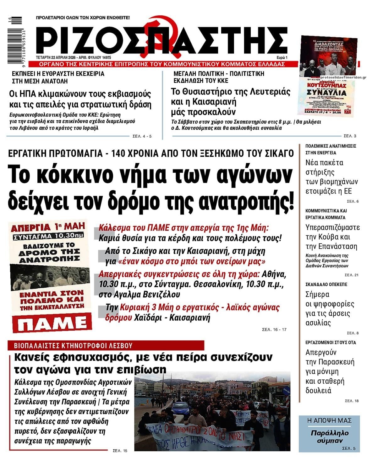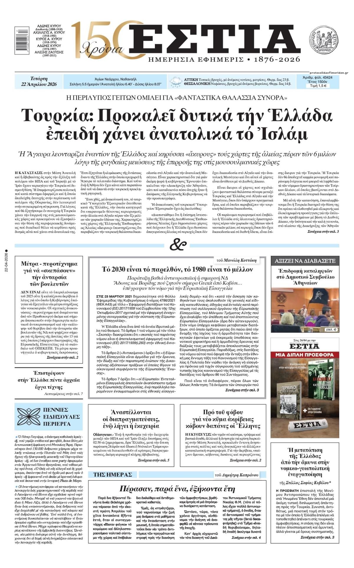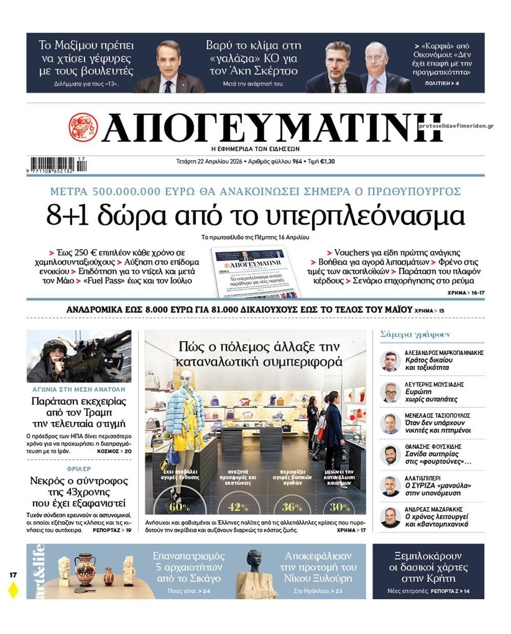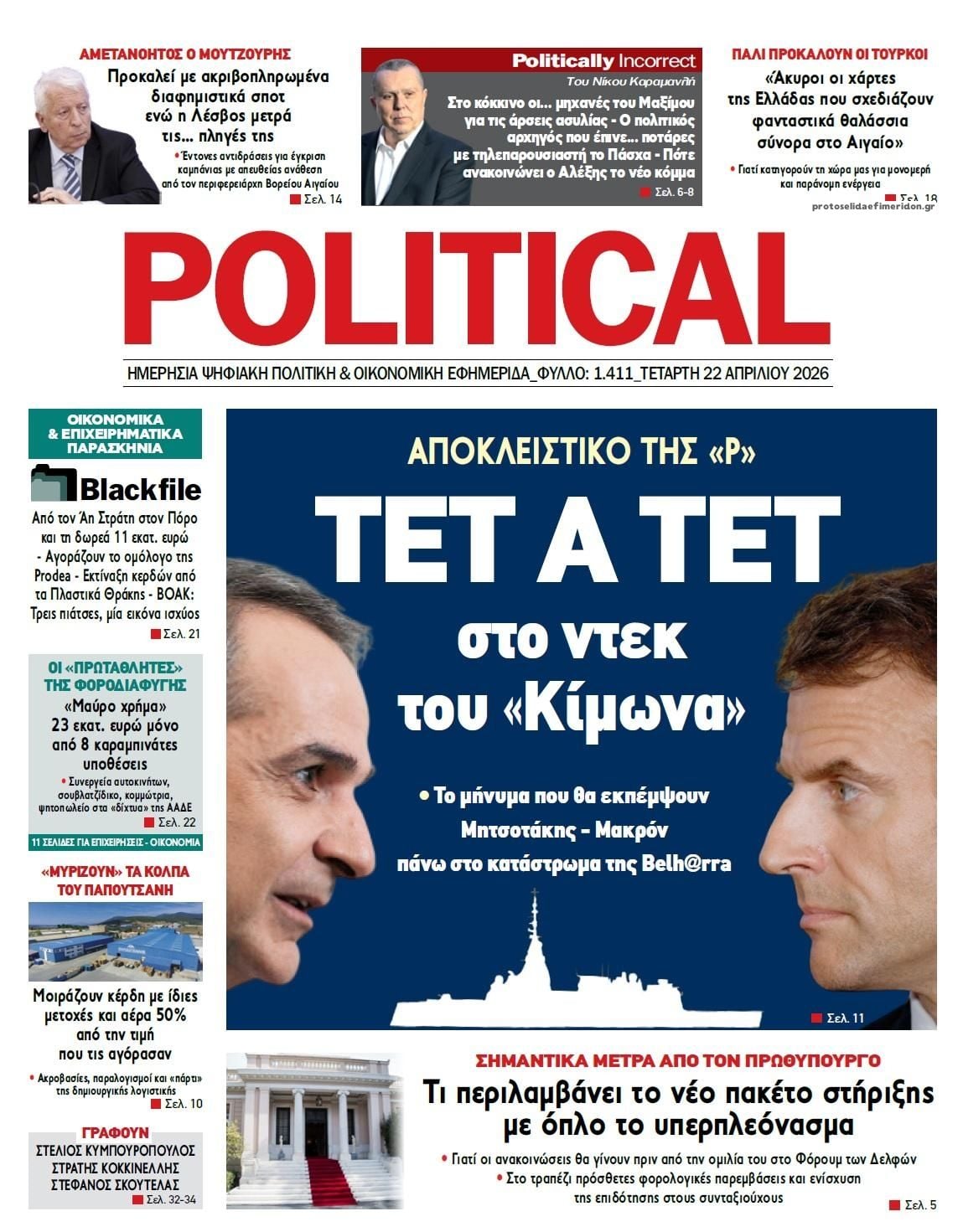 Διαβάστε τα πρωτοσέλιδα από τις πολιτικές εφημερίδες, σήμερα 22/4/2026.
