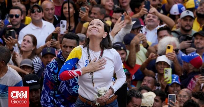 Η 58χρονη Ματσάδο που ζει στην παρανομία μετά τις προεδρικές εκλογές του Ιουλίου του 2024 τις οποίες η αντιπολίτευση δηλώνει ότι κέρδισε, κατηγορώντας τον πρόεδρο Νικολάς Μαδούρο που βρίσκεται στην εξουσία από το 2013 για νοθεία.