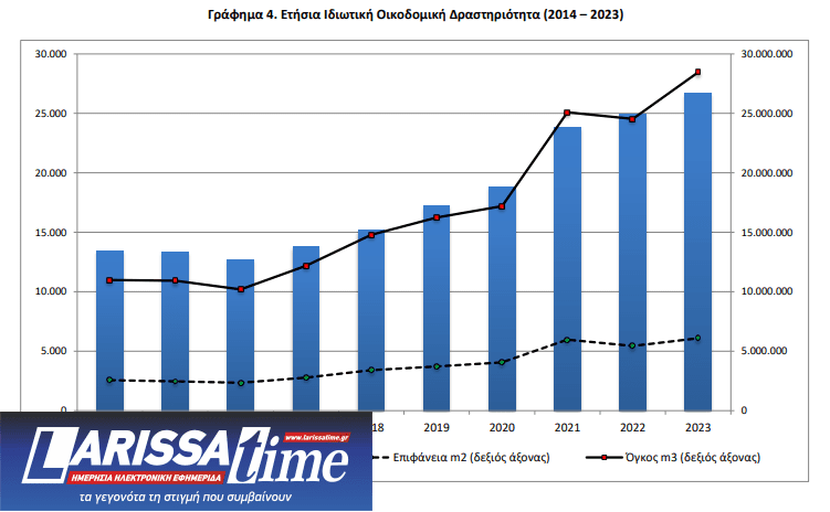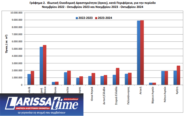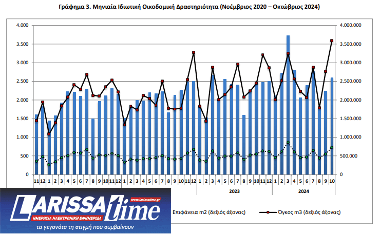 Κατά την περίοδο των τελευταίων δώδεκα μηνών, δηλαδή από τον Νοέμβριο 2023 έως τον Οκτώβριο 2024, το μέγεθος της Συνολικής Οικοδομικής Δραστηριότητας (Ιδιωτικής-Δημόσιας) με βάση τις εκδοθείσες οικοδομικές άδειες, στο σύνολο της Χώρας, ανήλθε σε 30.436 οικοδομικές άδειες, που αντιστοιχούν σε 7.243.985 m2 επιφάνειας και 32.740.264 m3 όγκου. Σε σχέση με την αντίστοιχη περίοδο Νοεμβρίου 2022 – Οκτωβρίου 2023 παρατηρήθηκε αύξηση κατά 12,8% στον αριθμό των οικοδομικών αδειών, αύξηση κατά 16,2% στην επιφάνεια και αύξηση κατά 13,3% στον όγκο.