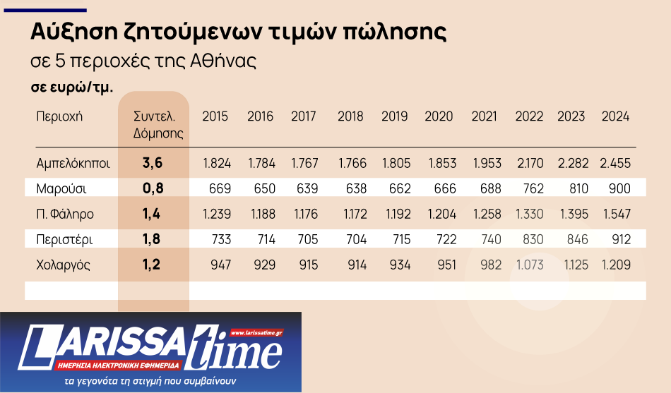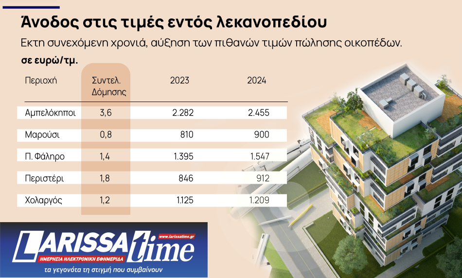 Η μικρότερη άνοδος καταγράφεται στο Περιστέρι (24,42%, από 7733 ευρώ σε 912 ευρώ) με Σ.Δ. 1,8 και το Χολαργό με συντελεστή δόμησης 1,2.