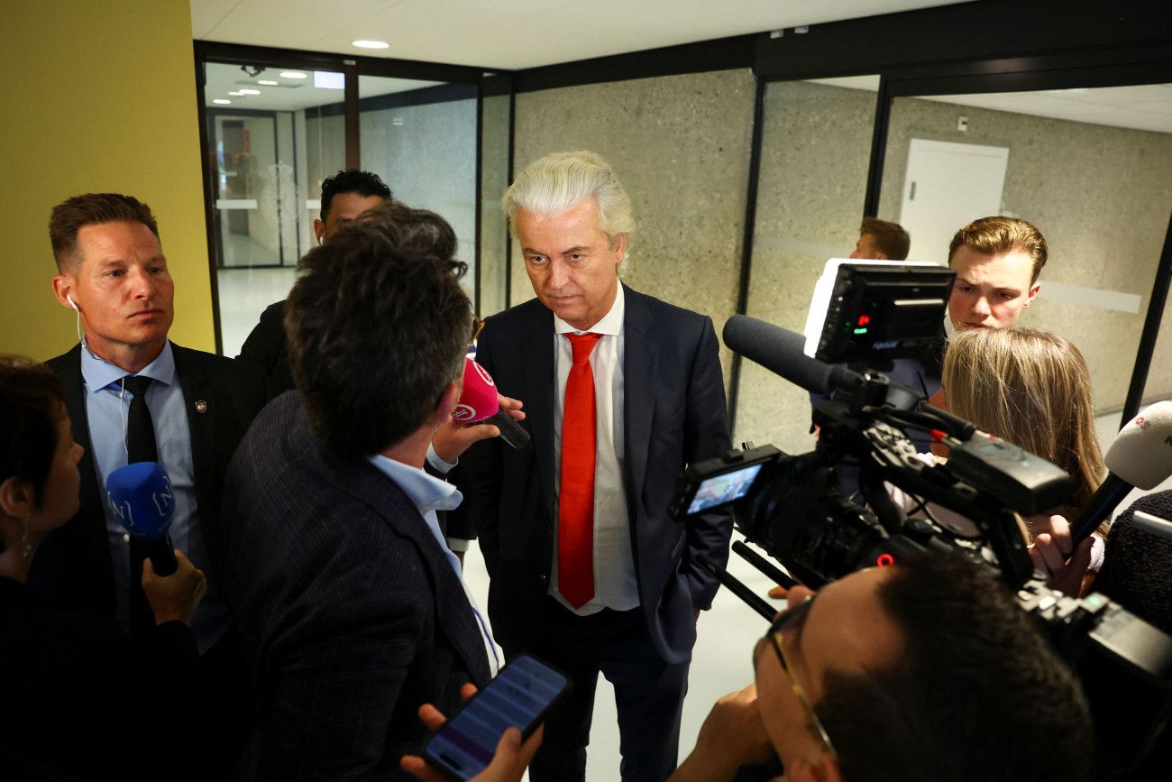 Ο Ολλανδός ακροδεξιός ηγέτης Γκέερτ Βίλντερς μιλάει στα μέσα ενημέρωσης. REUTERS/Piroschka van de Wouw
