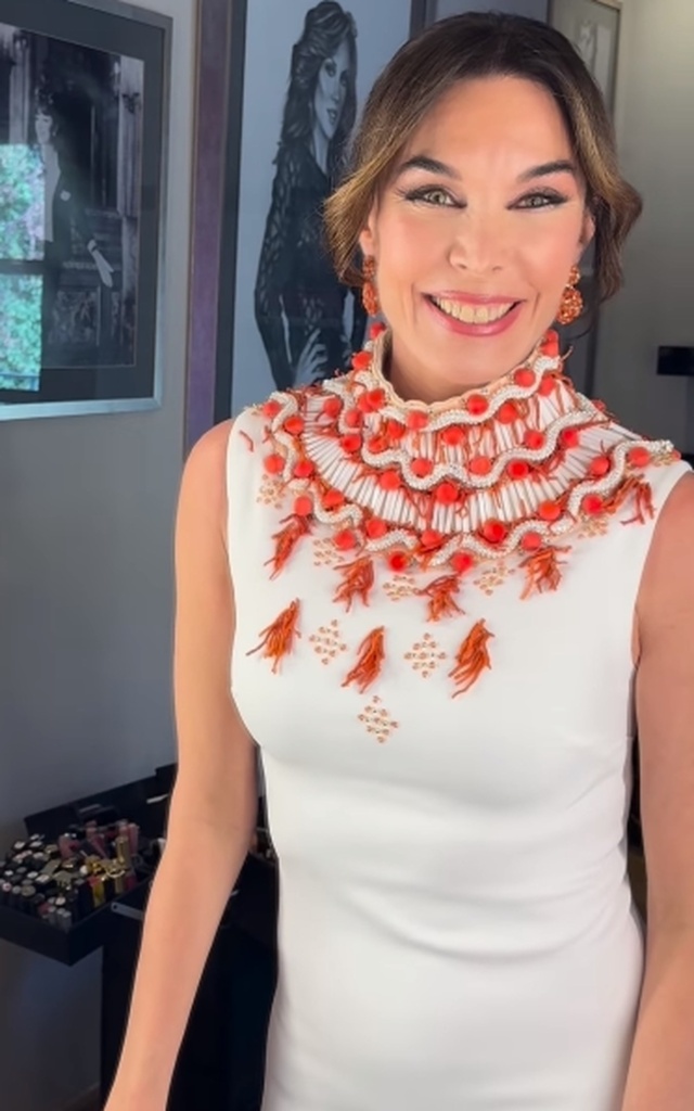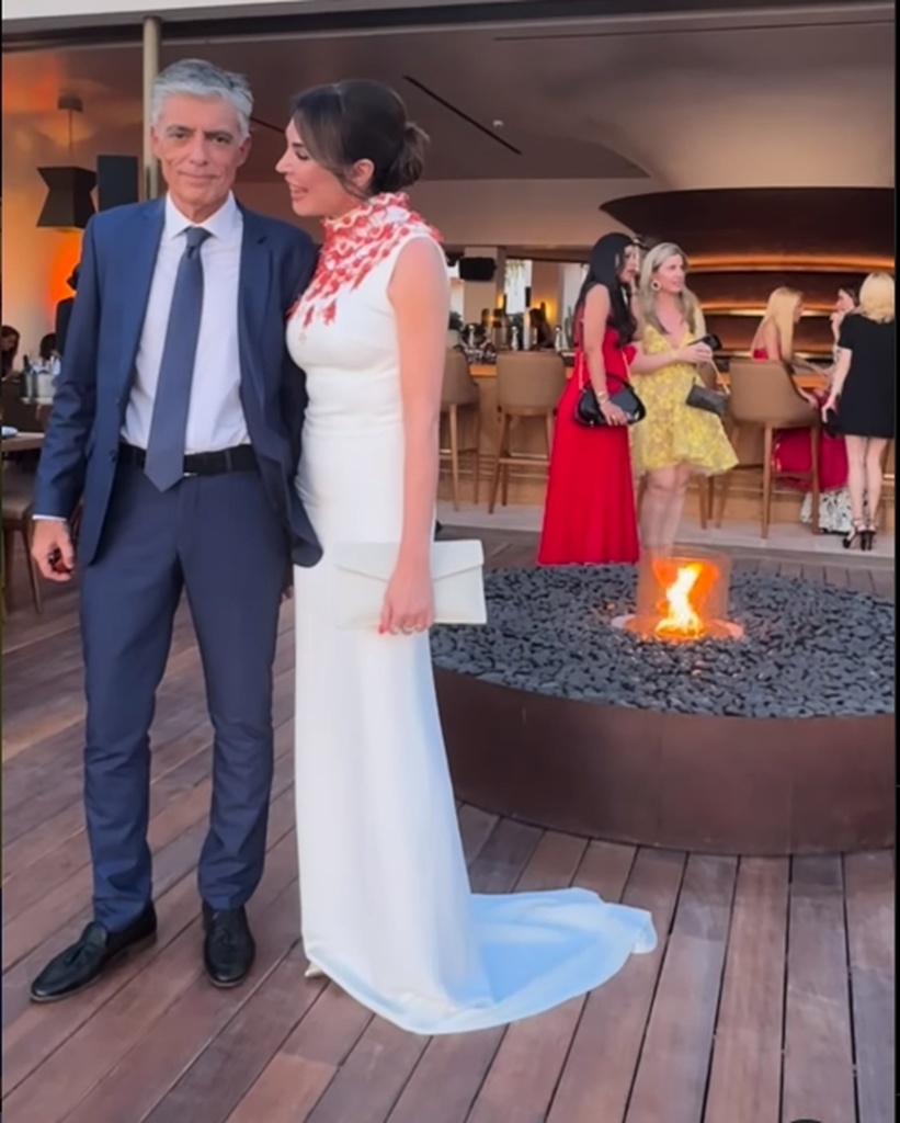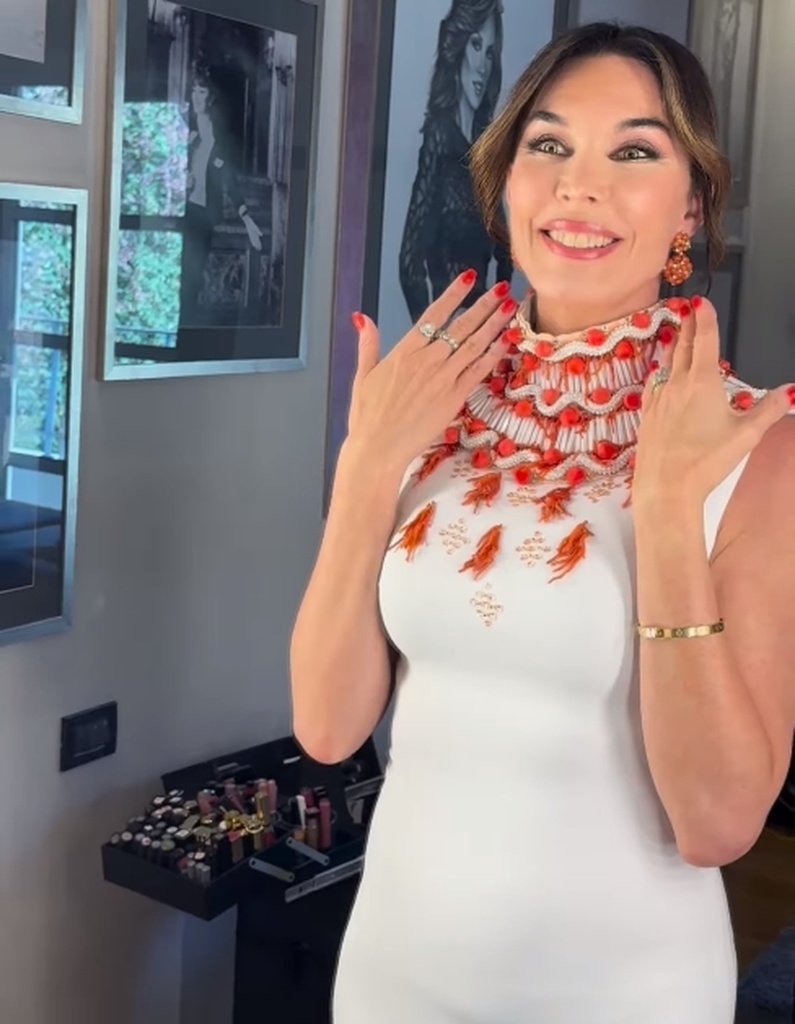 Η δημοσιογράφος ολοκλήρωσε το look της με κοσμήματα Imanoglou και τσάντα φάκελο σε off white απόχρωση.