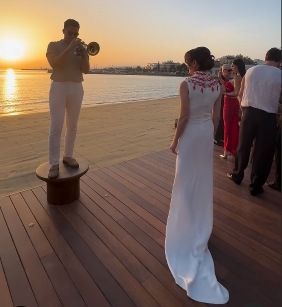 Για την περίσταση η Τατιάνα Στεφανίδου επέλεξε ένα λευκό μάξι φόρεμα με ουρά της σχεδιάστριας Celia Kritharioti. Η ολόλευκη δημιουργία ήταν αμάνικο με ψηλό λαιμό κεντημένο κόκκινες κλωστές και pom pom.