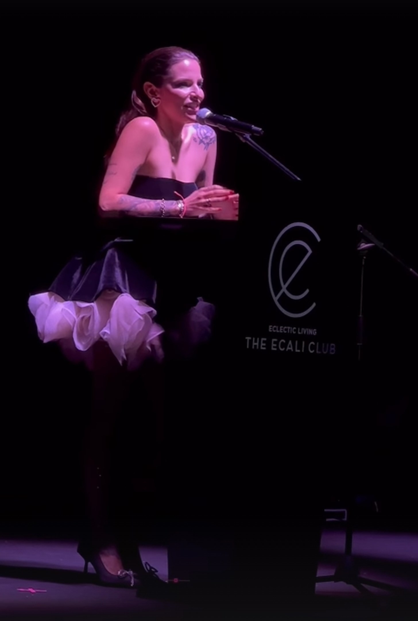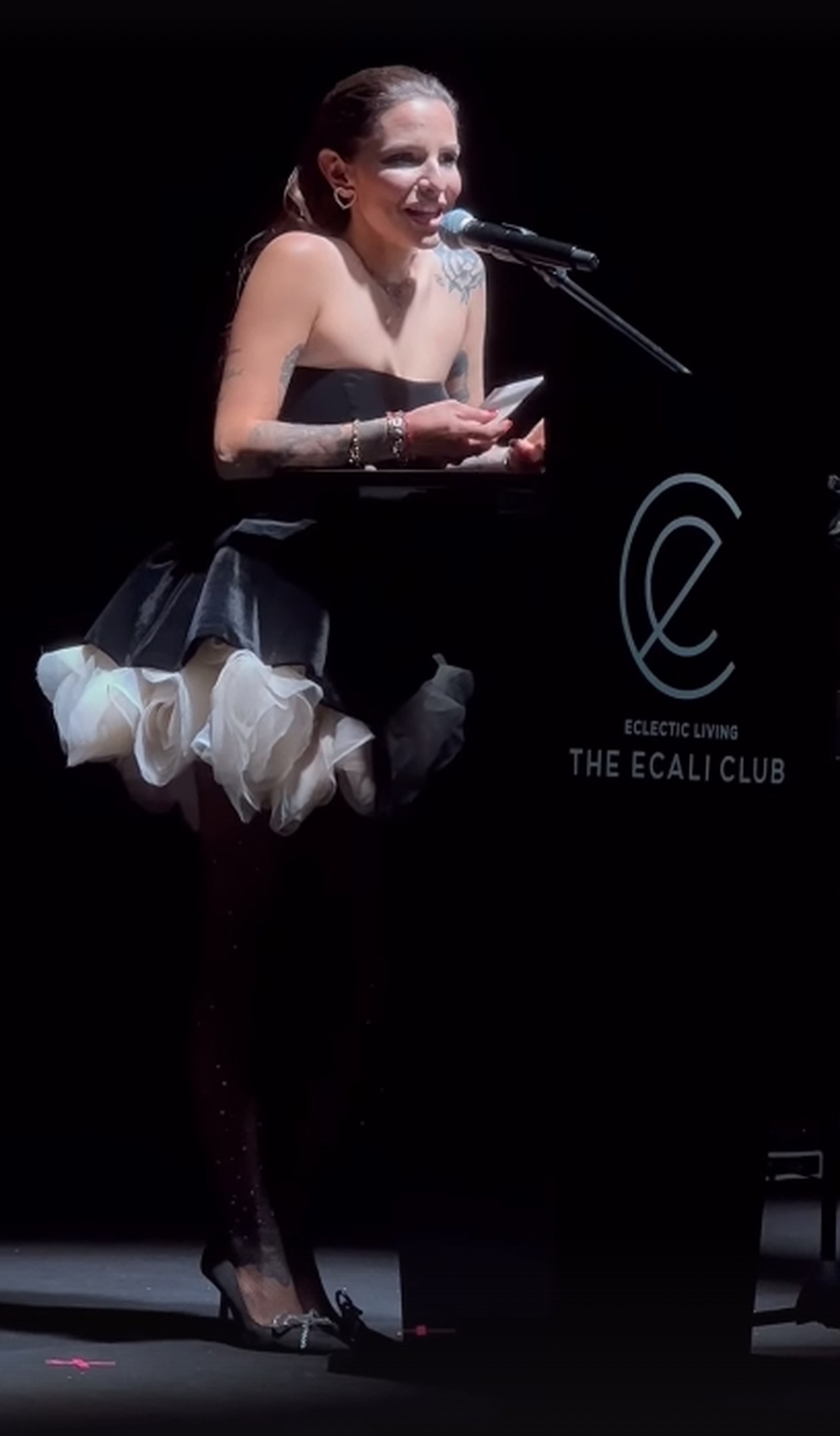 Η Εριέττα Κούρκουλου Λάτση ανέβηκε στην σκηνή για μια συγκινητική ομιλία, εκφράζοντας την υπερηφάνεια για το έργο του Save a Greek Stray. Εμφανίστηκε λαμπερή και ευδιάθετη, φορώντας ένα κομψό μαύρο φόρεμα.