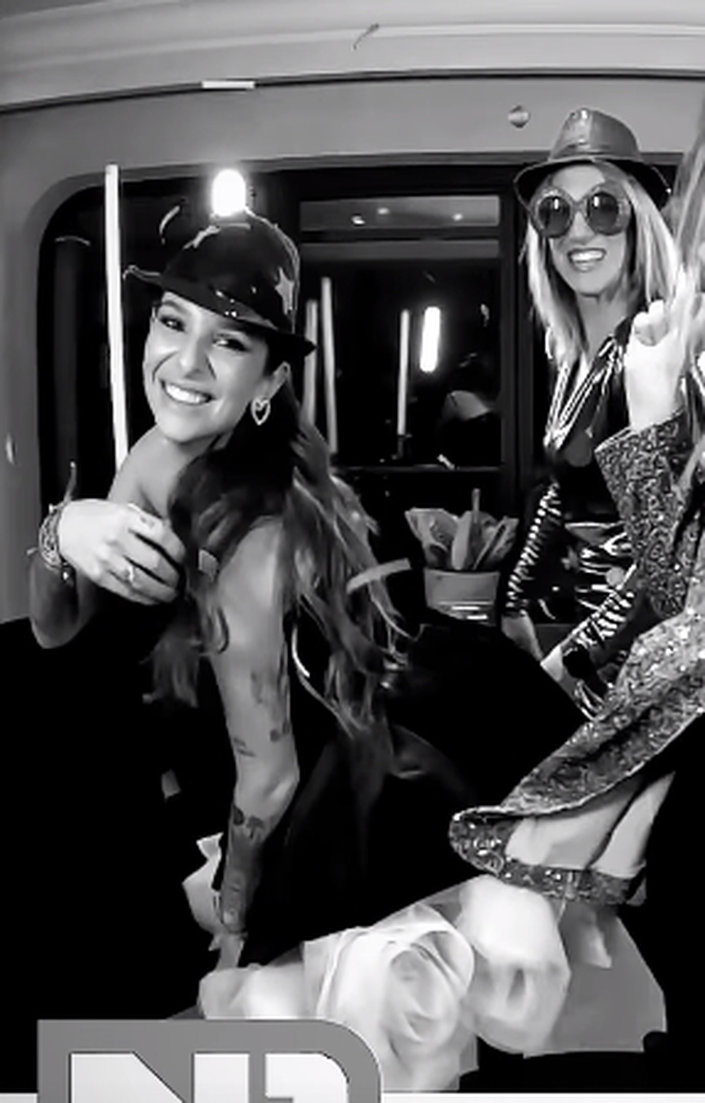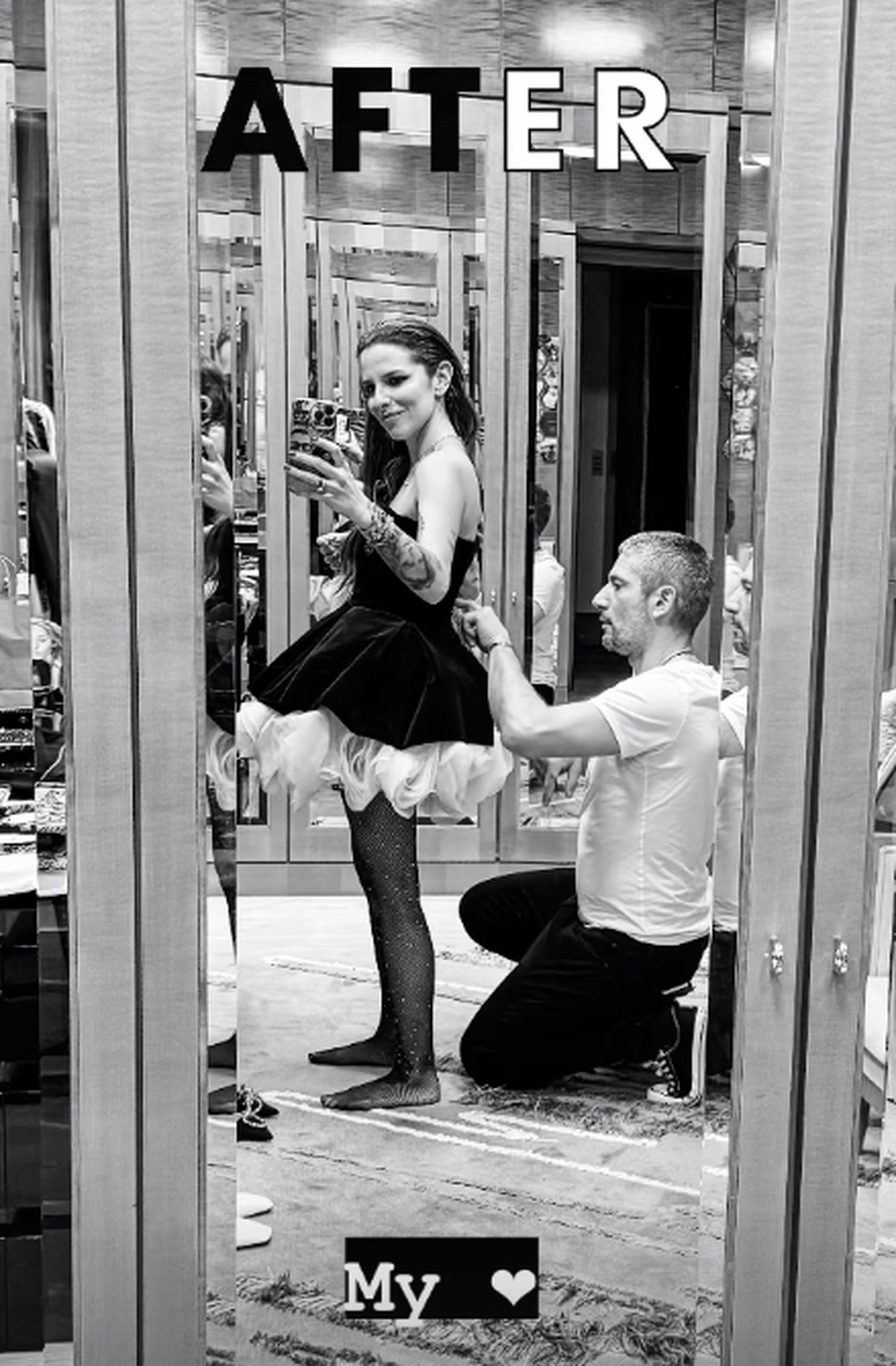 Το φόρεμά της ήταν μινιμαλιστικό, με στραπλές λεπτομέρειες και μίνι μήκος, με ένα μπούστο που αγκάλιαζε τέλεια το σώμα της και μια εντυπωσιακή μίνι φούστα με λουλούδια από οργάντζα. Για το σύνολό της, επέλεξε μαύρο διχτυωτό καλσόν με στρας και σατέν γόβες με λαμπερή αγκράφα-φιόγκο. Τα μακριά της μαλλιά ήταν χτενισμένα σε wet look, ενώ φορούσε ένα ζευγάρι σκουλαρίκια καρδιές.