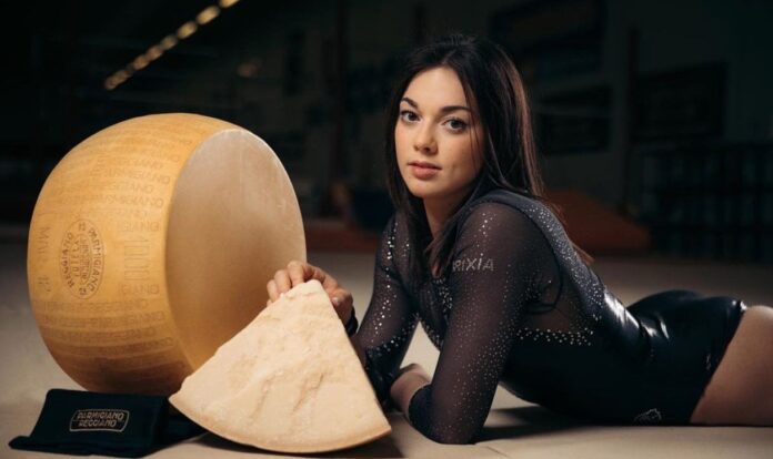 Olympic silver medalist and Italian gymnast Giorgia Villa is sponsored by parmesan cheese and takes many of her photos while posing with large wheels of cheese pic.twitter.com/klx8PEuFPN