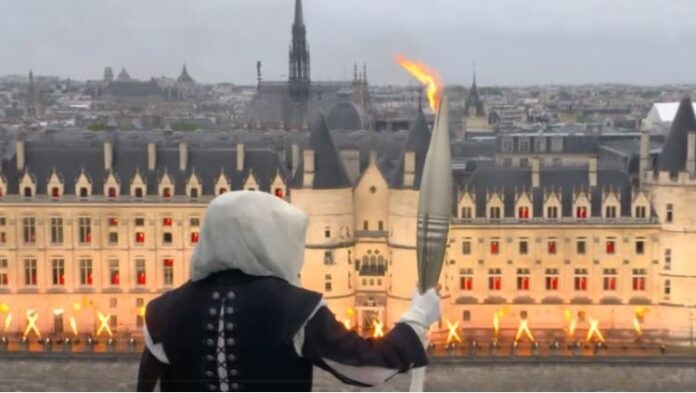 Καθ’ όλη τη διάρκεια της τελετής, ο δρομέας περιηγήθηκε στα εμβληματικά τοπόσημα του Παρισιού, εκτελώντας εντυπωσιακά ακροβατικά και πηδώντας από στέγη σε στέγη. Η μυστηριώδης παρουσία του πυροδότησε εικασίες για την ταυτότητά του, αφήνοντας τους θεατές να αναρωτιούνται ποιος κρυβόταν πίσω από τη μάσκα.