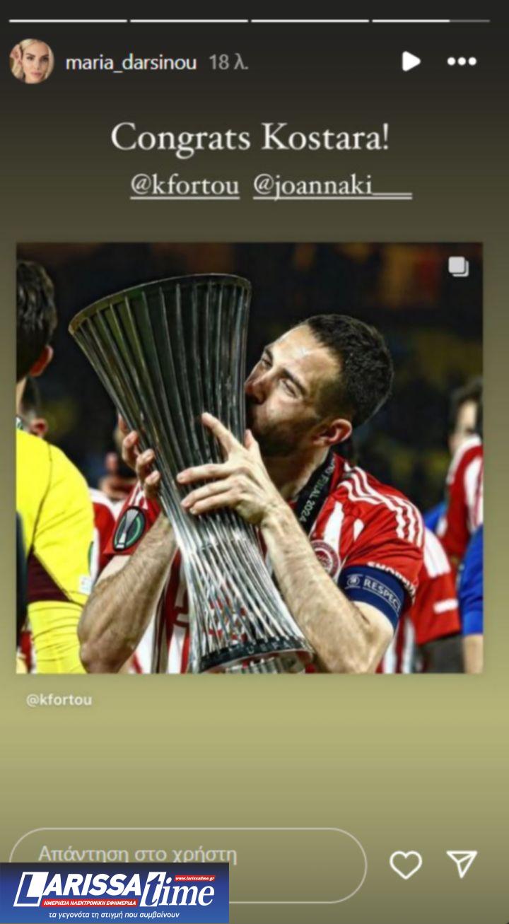 Οι παίκτες του Ολυμπιακού δέχονται από χθες συγχαρητήρια για το επίτευγμά τους. Ανάμεσα σε αυτούς που έστειλαν τις ευχές τους στον αρχηγό του Ολυμπιακού, Κώστα Φορτούνη, ήταν και η Μαρία Δαρσινού, που είναι η σύντροφος του αρχηγού του Παναθηναϊκού, Κώστα Σλούκα.
