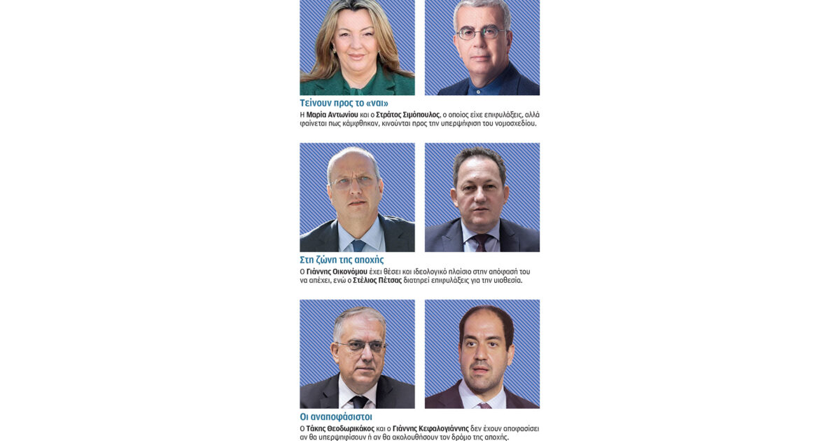 Προς υπερψήφιση πλέον του νομοσχεδίου κινούνται η Μαρία Αντωνίου και ο Στράτος Σιμόπουλος, ο οποίος είχε επιφυλάξεις αλλά φαίνεται πως κάμφθηκαν μετά τις ανακοινώσεις για την ενίσχυση της οικογένειας. Με ενστάσεις εξακολουθεί να είναι ο Διαμαντής Γκολιδάκης, αλλά πλέον υπάρχουν πολλές πιθανότητες να κινηθεί προς το «ναι». Στην κατηγορία των αναποφάσιστων ήταν και η Σέβη Βολουδάκη, που έχει μεν επιφυλάξεις, αλλά συμφωνεί επί της αρχής με τη μεταρρυθμιστική ατζέντα και εικάζεται βασίμως πως τελικά θα υπερψηφίσει. Επιφυλάξεις διατηρεί ακόμη ο Λάζαρος Τσαβδαρίδης, λέγοντας ωστόσο σε συνομιλητές του πως η υπερψήφιση είναι κάτι που εξετάζει σοβαρά.