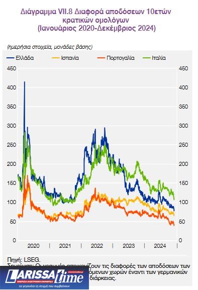 Οι διαφορές αποδόσεων των ελληνικών ομολόγων έναντι άλλων κρατικών ομολόγων της ευρωζώνης έχουν μειωθεί σημαντικά. Συγκεκριμένα, η διαφορά αποδόσεων (spread) του ελληνικού δεκαετούς ομολόγου έναντι του αντίστοιχου γερμανικού τίτλου βρισκόταν περίπου στις 81 μ.β. στις 13.12.2024, περίπου 114 μ.β. χαμηλότερη σε σχέση με το μέσο επίπεδό της το α΄ τρίμηνο του 2023, δηλ. πριν τη διαμόρφωση προσδοκιών για επι-κείμενη αναβάθμιση στην επενδυτική κατηγορία. Επίσης, οι αποδόσεις των ελληνικών κρατικών ομολόγων έχουν μειωθεί και έναντι άλλων ομολόγων της ευρωζώνης με συγκρίσιμη αξιολόγηση, όπως τα ιταλικά κρατικά ομόλογα (ενδεικτικά, η διαφορά μεταξύ ελληνικού και ιταλικού δεκαετούς ομολόγου ήταν -33 μ.β. στις 13.12.2024, έναντι -11 μ.β. την 1.1.2023).