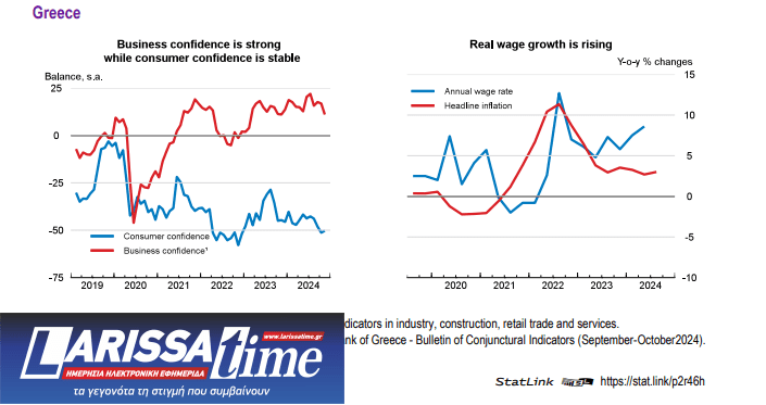 Στην έκθεση επισημαίνεται ότι το πραγματικό ΑΕΠ αυξήθηκε κατά 1,6% το έτος το δεύτερο τρίμηνο του 2024, λόγω των ισχυρών ακαθάριστων κεφαλαίων και της κατανάλωσης. Οι επιχειρηματικές προσδοκίες στον τομέα της μεταποίησης και των υπηρεσιών συνέχισαν να κατευθύνονται προς την επέκταση τον Σεπτέμβριο. Η απασχόληση αυξήθηκε κατά 1,6% από την αρχή του έτους έως τον Σεπτέμβριο του 2024, ενώ οι ονομαστικοί μισθοί αυξήθηκαν κατά 8,6% έως το δεύτερο τρίμηνο του 2024, καθώς οι ελλείψεις εργατικού δυναμικού παραμένουν σε ιστορικά υψηλά επίπεδα επίπεδα.