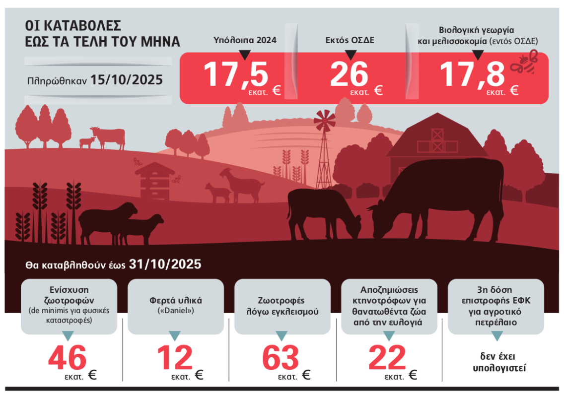 Έως το τέλος Οκτωβρίου θα πιστωθούν στους λογαριασμούς των δικαιούχων περισσότερα από 200 εκατ. ευρώ (για την ακρίβεια 204,3 εκατ.) που προκύπτουν από υπόλοιπα επιδοτήσεων του 2024 και από αποζημιώσεις για την ευλογιά. Παράλληλα, η κυβέρνηση «τρέχει» να προλάβει τις προθεσμίες, ώστε να ικανοποιήσει τους όρους που έχει θέσει η Κομισιόν σε δύο επιστολές της, τις οποίες έχει στη διάθεσή της η «R», για τις πληρωμές του 2025. Ένας από τους όρους αυτούς είναι ότι για τις δηλώσεις των αγροτών του 2025 θα απαιτείται η συμπλήρωση Αριθμού Ταυτότητας Ακινήτου, με προθεσμία έως τις 20 Οκτωβρίου, ώστε να διασφαλιστεί η διαφάνεια των επιδοτήσεων. Είναι αξιοσημείωτο πάντως πως όλα τα προηγούμενα χρόνια οι δηλώσεις των καλλιεργήσιμων εκτάσεων γίνονταν χωρίς ΑΤΑΚ ή δεν τις ήλεγχε κανείς.