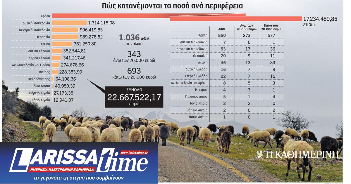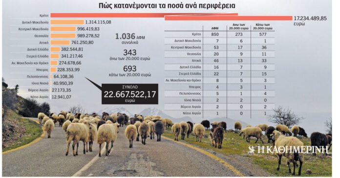 Η μερίδα του λέοντος φαίνεται πως κατέληξε στην Κρήτη, καθώς εκεί αντιστοιχούν οι 850 ΑΦΜ, με το ποσό των παράνομων ενισχύσεων που φέρεται να έλαβαν να φτάνει στα 17,2 εκατ. ευρώ. Ενδεικτικό της έκτασης της παραβατικότητας στο νησί, βάσει των στοιχείων που τέθηκαν υπόψη της «Κ», είναι ότι από τις 15 περιπτώσεις ατόμων που εισέπραξαν πάνω από 100.000 ευρώ σε ενισχύσεις χωρίς να τις δικαιούνται, οι 10 βρίσκονται στην Κρήτη.