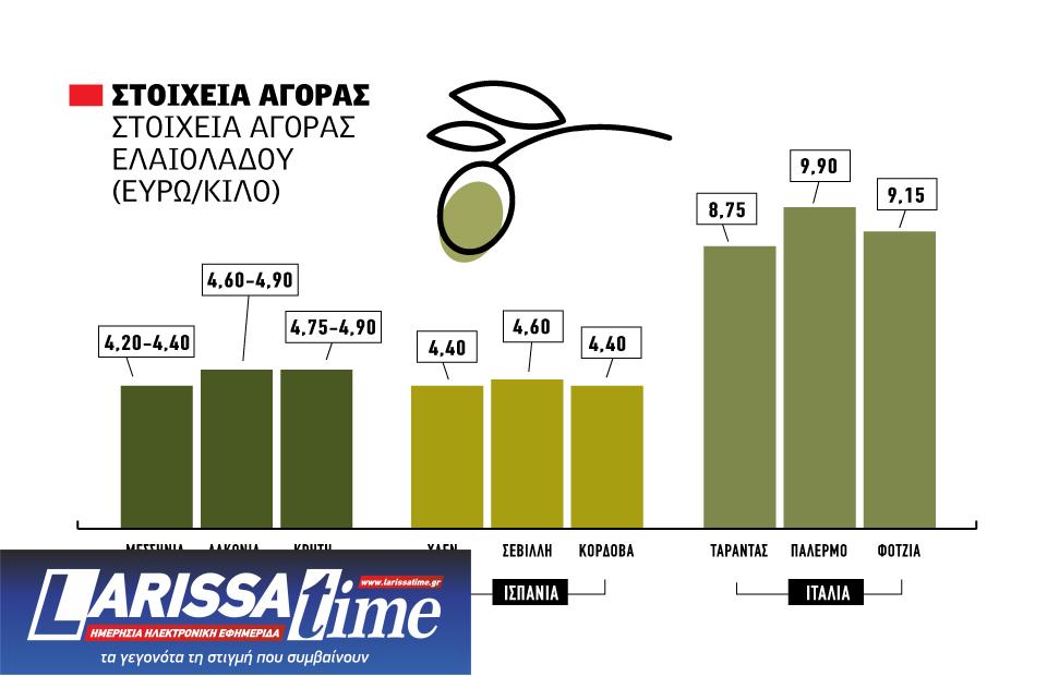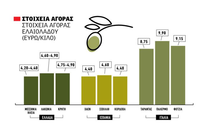 Στην Ελλάδα, όποιος θέλει να πουλήσει αυτές τις µέρες έξτρα παρθένο ή θα βρει κλειστές πόρτες ή θα πρέπει να αποδεχτεί πως οι τιµές παραγωγού κυµαίνονται από 4,20 έως 4,90 ευρώ το κιλό. Εσχάτως, ο Αγροτικός Ελαιουργικός Συνεταιρισµός Παπαδιανίκων διέθεσε 85 τόνους στα 4,90 ευρώ το κιλό, ενώ σηµειώθηκαν αρκετές πράξεις σε γειτονικούς νοµούς της Λακωνίας κάτω από 4,50 ευρώ το κιλό.