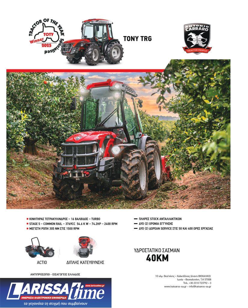 Η εταιρεία ANTONIO CARRARO, ηγέτης στην κατασκευή συµπαγών και εξειδικευµένων τρακτέρ για ειδικές καλλιέργειες, µε συνεχόµενες έρευνες, παρέχει προηγµένες τεχνολογικές λύσεις «έξυπνης» γεωργίας. Για το 2025 λανσάρουµε στην αγορά των γεωργικών ελκυστήρων, το «αστέρι» της ANTONIO CARRARO, το ΤΟΝΥ TRG..»