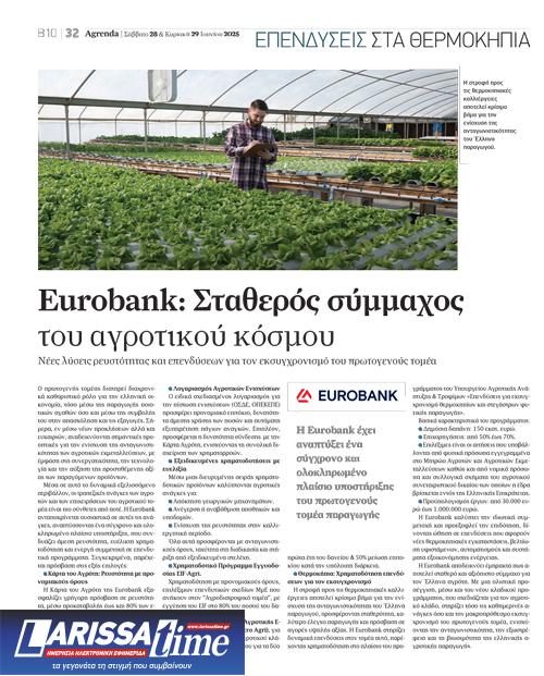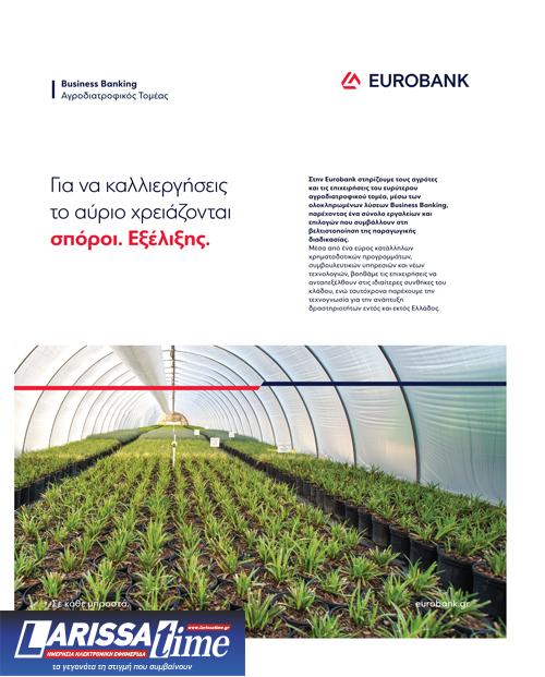 Η Eurobank αποδεικνύει έµπρακτα πως αποτελεί σταθερό και αξιόπιστο σύµµαχο για τον Έλληνα αγρότη. Με µια ολιστική προσέγγιση, µέσω και του νέου κλαδικού προγράµµατος, που σχεδιάζεται για τον αγροτικό κλάδο, στηρίζει τόσο τις καθηµερινές ανάγκες όσο και τον µακροπρόθεσµο εκσυγχρονισµό του πρωτογενούς τοµέα, ενισχύοντας την ανταγωνιστικότητα, την εξωστρέφεια και τη βιωσιµότητα της ελληνικής αγροτικής παραγωγής.