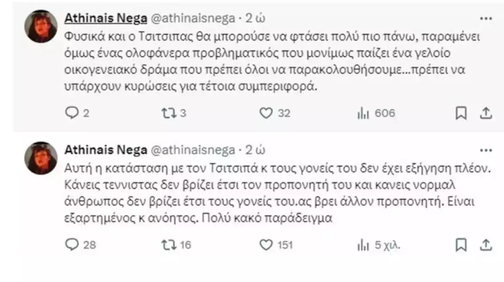 Ενώ σε άλλη της ανάρτηση πρόσθεσε, «Αυτή η κατάσταση με τον Τσιτσιπά και τους γονείς του δεν έχει εξήγηση πλέον. Κανείς τενίστας δεν βρίζει έτσι τον προπονητή του και κανείς νορμάλ άνθρωπος δεν βρίζει έτσι τους γονείς του. Ας βρει άλλον προπονητή. Είναι εξαρτημένος κι ανόητος. Πολύ κακό παράδειγμα».
