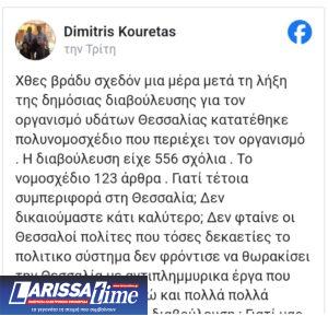 “Χθες βράδυ σχεδόν μια μέρα μετά τη λήξη της δημόσιας διαβούλευσης για τον οργανισμό υδάτων Θεσσαλίας κατατέθηκε πολυνομοσχέδιο που περιέχει τον οργανισμό .