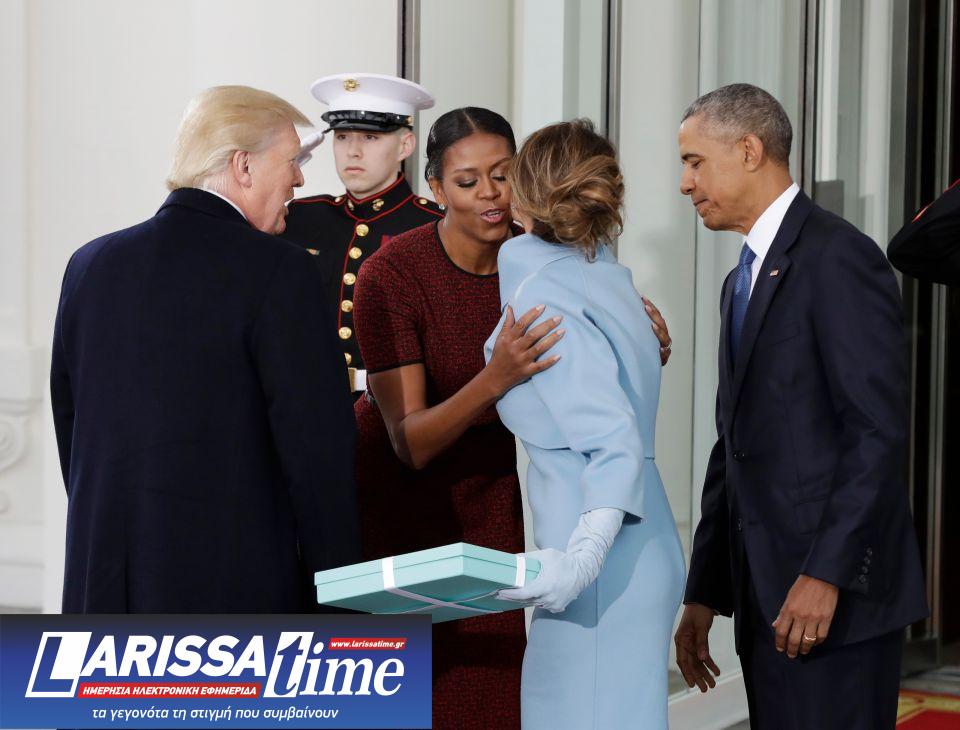 Φωτογραφία από την υποδοχή της Μελάνια Τραμπ από τη Μισέλ Ομπάμα στον Λευκό Οίκο, λίγο πριν από την πρώτη ορκωμοσία του Ντόναλντ Τραμπ