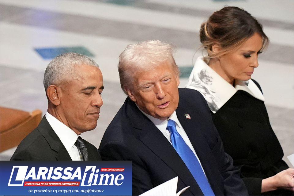 O πρώην πρόεδρος Μπαράκ Ομπάμα με τον Ντόναλντ Τραμπ κατά τη διάρκεια της κηδείας του Τζίμι Κάρτερ