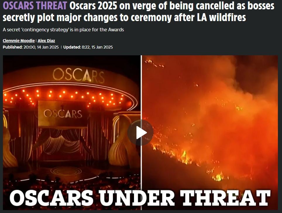 Οι φωτιές που μαίνονται στο Λος Άντζελες έχουν προκαλέσει κύμα φημών σχετικά με το μέλλον της 97ης τελετής των βραβείων Όσκαρ, η οποία έχει προγραμματιστεί για την Κυριακή 2 Μαρτίου. Ορισμένα μέσα ενημέρωσης, όπως η βρετανική ταμπλόιντ The Sun, δημοσίευσαν αβάσιμες αναφορές ότι η Ακαδημία Κινηματογράφου εξετάζει την ακύρωσή τους.