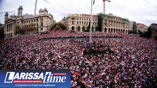 Πολλοί από τους συγκεντρωμένους κρατούσαν λάβαρα με τα εθνικά χρώματα και πλακάτ που έγραφαν «Οι Ούγγροι εξεγείρονται!».