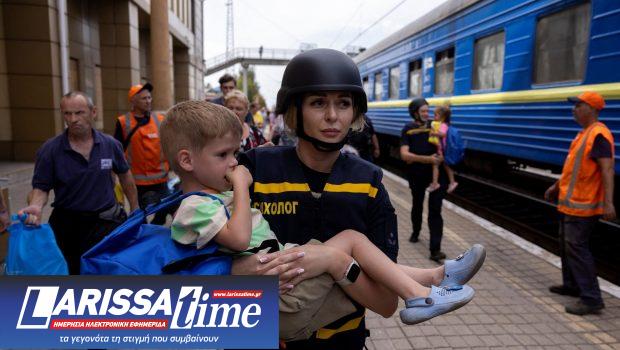 Κάτοικος του Ποκρόβσκ αποχαιρετά τη σύζυγο και την κόρη του που φεύγουν μακριά από την εμπόλεμη ζώνη.