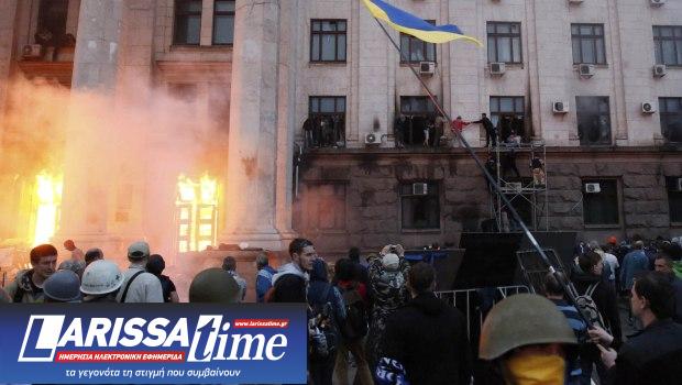 Όλα ξεκίνησαν από τη πλατεία μπροστά στο κτήριο. Οι Ουκρανοί εθνικιστές, ανάμεσα τους και οπλισμένα μέλη του Δεξιού Τομέα, επιτίθενται και καίνε τις σκηνές των φιλορώσων. Σύντομα η πλατεία κατακλύζεται από μαύρους καπνούς και φλόγες.