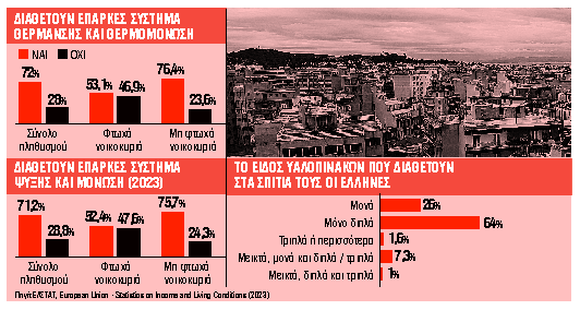 Αναφορικά με την επάρκεια του συστήματος θέρμανσης και της θερμομόνωσης για να διατηρήσουν ζεστή την κατοικία τους, σχεδόν το 30% απάντησε αρνητικά, με το ποσοστό για τον φτωχό πληθυσμό να ανέρχεται στο 53,1%. Οσο για το εάν οι κατοικίες διαθέτουν σύστημα ψύξης και μόνωση, το 71,2% δήλωσε ότι διαθέτει σύστημα ψύξης και μόνωση για να διατηρήσει δροσερή την κατοικία του, όμως για τον φτωχό πληθυσμό το αντίστοιχο ποσοστό ανέρχεται σε 52,4%.