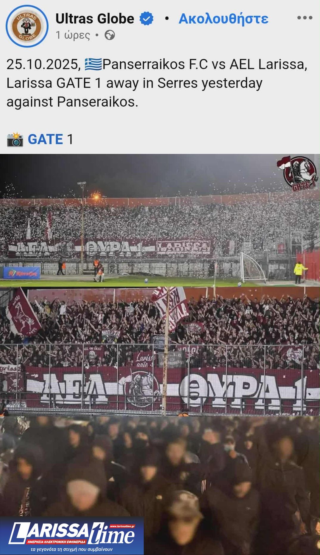 Μία οπαδική σελίδα στο facebook, Ultras Globe, η οποία αριθμεί περισσότερα από 153.000 μέλη, ανάρτησε φωτογραφίες από την εξέδρα των φιλάθλων της ΑΕΛ από την εκτός έδρας αναμέτρηση με τον Πανσερραϊκό, που έγινε το Σάββατο (25/10) στο Δημοτικό Στάδιο Σερρών.