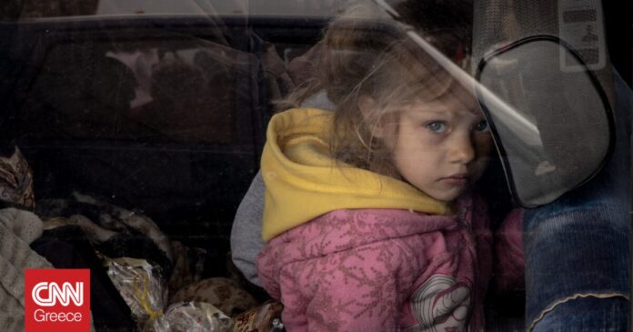 Ένα αγόρι από τη Μαριούπολη κοιτάζει από το σπασμένο παράθυρο του οικογενειακού του αυτοκινήτου, έχοντας φτάσει στο σημείο εκκένωσης, στις 2 Μαΐου 2022, στην πόλη Ζαπορίζια της Ουκρανίας.