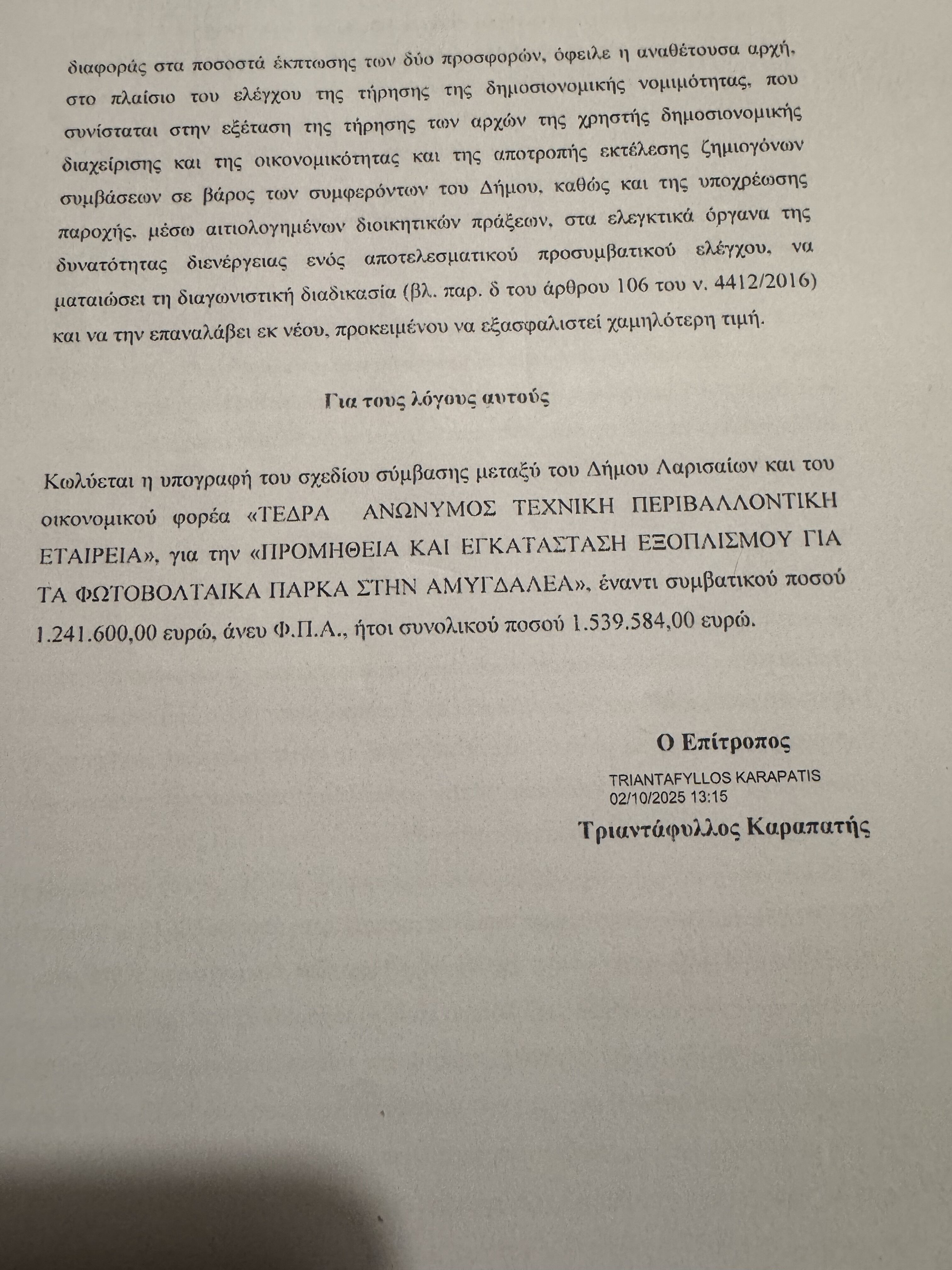 Ερωτηματικά προκαλεί ο διαγωνισμός του Δήμου Λαρισαίων για την κατασκευή δυο φωτοβολταϊκών πάρκων στην περιοχή της Αμυγδαλέας ο οποίος κατακυρώθηκε στην τοπική «ΤΕΔΡΑ Κατασκευαστική» με κόστος ασυνήθιστα υψηλό, γεγονός που είχε ως συνέπεια το Ελεγκτικό συνέδριο να μην εγκρίνει την διαγωνιστική διαδικασία.