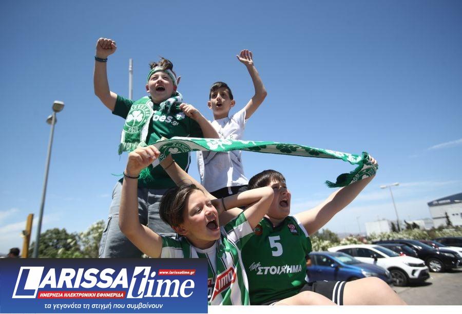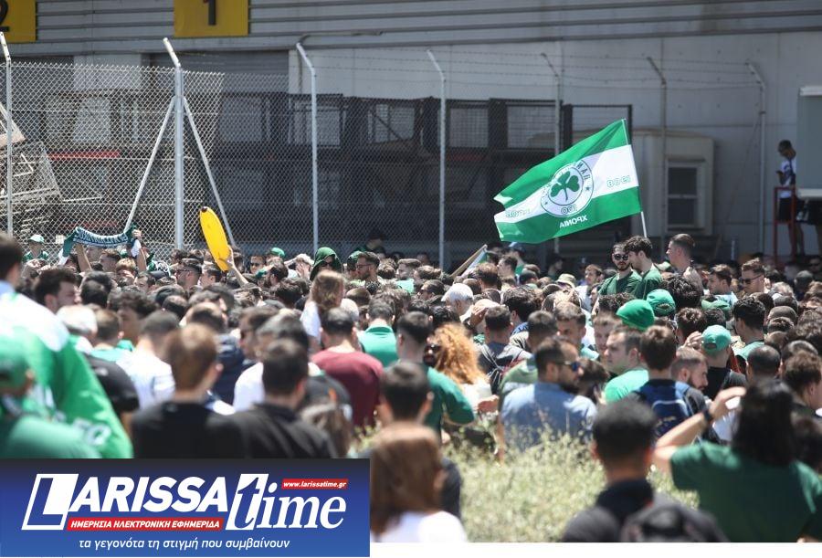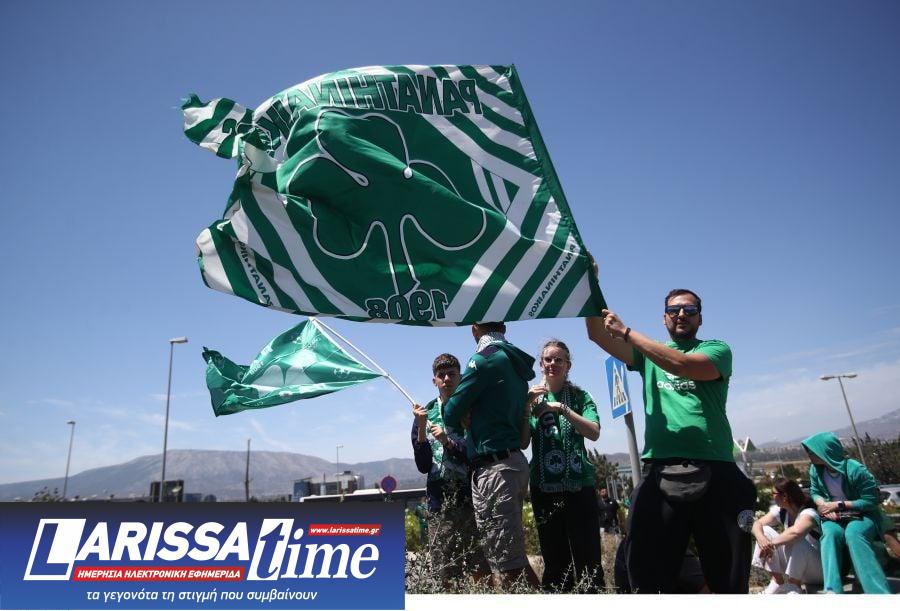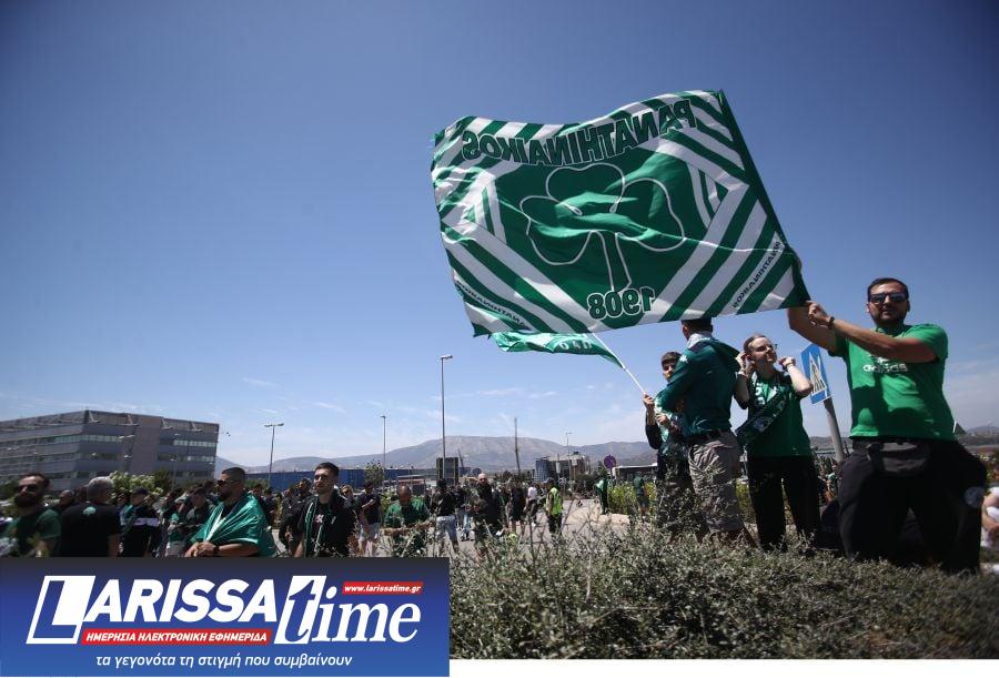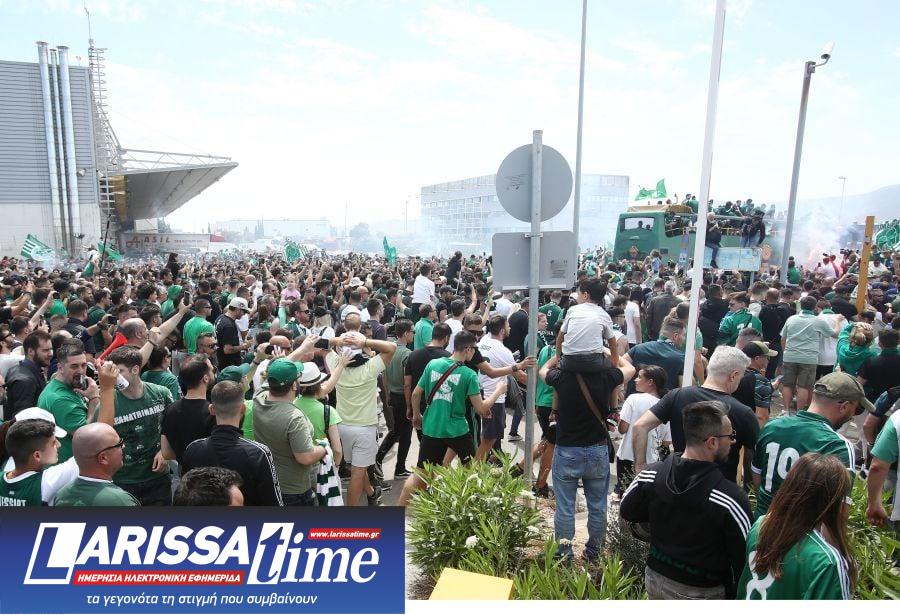 Μόλις το πούλμαν έφτασε έξω από το ΟΑΚΑ και ενώ ακουγόταν από τα ηχεία ο ύμνος της ομάδας, οι φίλοι του Παναθηναϊκού άρχισαν να ανάβουν καπνογόνα και να αποθεώνουν τους «πράσινους», οι οποίοι ανέβηκαν στην κορυφή της Ευρώπης για έβδομη φορά στην ιστορία τους.