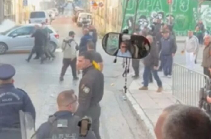 Ομάδα περίπου 20 οπαδών επιτέθηκε στο πούλμαν και εκτόξευσε αντικείμενα, με την αστυνομία να παρεμβαίνει άμεσα και να απομακρύνει τους οπαδούς από το σημείο.
