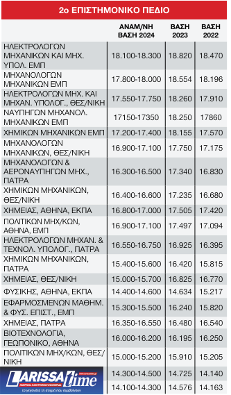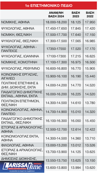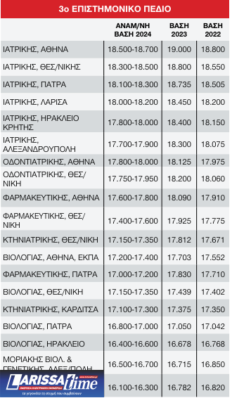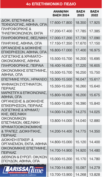 Στο τρίτο πεδίο που ανήκουν και οι ιατρικές σχολές, η Βιολογία και η Φυσική θα φρενάρουν αρκετά τις βάσεις κυρίως στα υψηλά κλιμάκια. Στο τέταρτο πεδίο που ανήκουν οι οικονομικές σχολές και οι σχολές πληροφορικής θα δούμε μικρές μειώσεις που οφείλονται στα δυσκολότερα θέματα των Μαθηματικών.