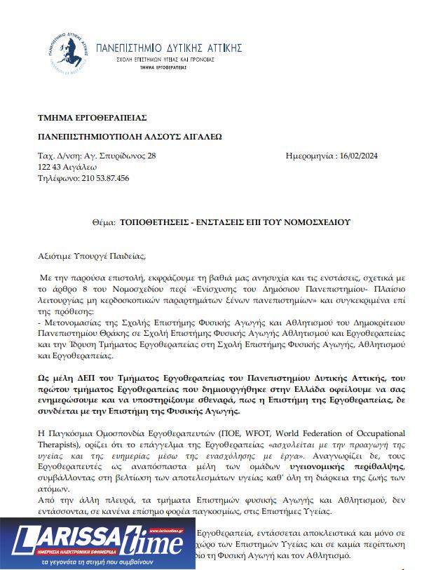 Την έντονη ανησυχία τους, αλλά και την κάθετη αντίθεσή τους στην μετονομασία της Σχολής Επιστήμης Φυσικής Αγωγής και Αθλητισμού του Δημοκρίτειου Πανεπιστημίου Θράκης σε Σχολή Επιστήμης Φυσικής Αγωγής Αθλητισμού και Εργοθεραπείας εκφράζουν τα μέλη ΔΕΠ του Τμήματος Εργοθεραπείας του Πανεπιστημίου Δυτικής Αττικής, του πρώτου τμήματος Εργοθεραπείας που δημιουργήθηκε στην Ελλάδα, με επιστολή τους προς τον υπουργό Παιδείας Κυριάκο Πιερρακάκη.