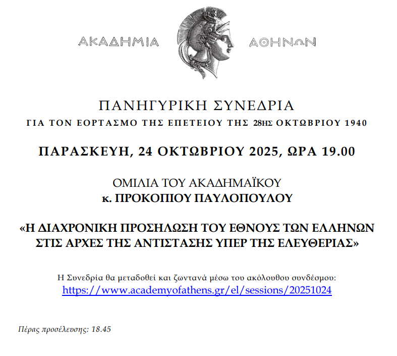Την Παρασκευή, 24 Οκτωβρίου 2025 και ώρα 19.00, θα πραγματοποιηθεί στην Αίθουσα Τελετών, η Πανηγυρική Συνεδρία της Ακαδημίας Αθηνών για τον Εορτασμό της Επετείου της 28ης Οκτωβρίου 1940.