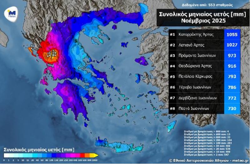 Από ιδιαίτερα αυξημένες βροχοπτώσεις χαρακτηρίστηκε ο Νοέμβριος του 2025, κυρίως στη Δυτική Ελλάδα και την Ήπειρο, σύμφωνα με τις καταγραφές του εκτεταμένου δικτύου αυτόματων μετεωρολογικών σταθμών του meteo.gr / Εθνικού Αστεροσκοπείου Αθηνών.