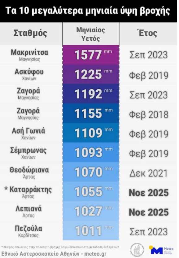 Τα δέκα μεγαλύτερα μηνιαία ύψη βροχής εμφανίζονται κυρίως σε τρεις περιόδους με έντονα καιρικά φαινόμενα: τον Φεβρουάριο 2019 (κακοκαιρίες Χιόνη και Ωκεανίς), τον Σεπτέμβριο 2023 (κακοκαιρίες Daniel και Ηλίας) και τον Νοέμβριο 2025 (κακοκαιρία Adel).